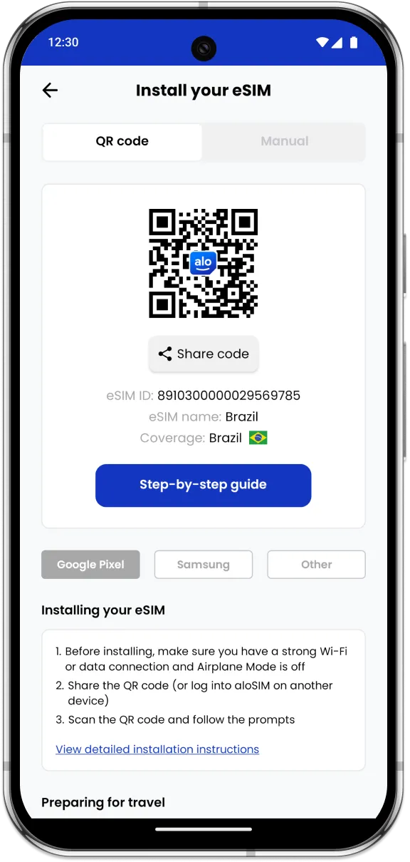 Todos os telefones e tablets compatíveis com eSIM (incluindo telefones Google Pixel e dispositivos Samsung ) oferecem a opção de instalação do eSIM por código QR ou instalação manual , e todas as três opções levam menos de dois minutos no total.