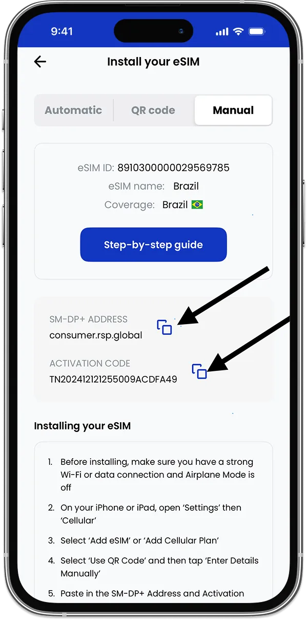Se você estiver instalando um eSIM em um iPhone ou iPad , poderá ter a opção de instalação automática do eSIM caso esteja usando a versão mais recente do iOS (sistema operacional do iPhone).